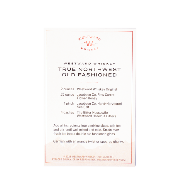Experience the essence of the Pacific Northwest with our True Northwest Old Fashioned Cocktail Kit. This thoughtfully curated assortment includes everything you need to craft our signature Old Fashioned, infused with the flavors of Oregon. Featuring our rich and bold Westward Whiskey Original, along with locally crafted ingredients like Jacobsen Co.‘s raw carrot flower honey and hand-harvested sea salt, and The Bitter Housewife’s hazelnut bitters, this kit brings a taste of the True Northwest to your home bar.